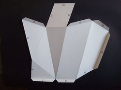 Es quizá a partir de esta reflexion y de las charlas con mis amigos grabadores, quienes permanentemente usan el correo para la circulación de obra, que se me ocurrió rehacer mis esculturas de metal – pesadas - teniendo como punto de partida ya no el objeto, sino la forma de traslado, es decir, no pensé en alivianar el peso de las obras para que se muevan más facilmente, sino en esculturas cuya identidad este vinculada al hecho de ser trasladadas, a la no pretensión de permanencia. Pues bien, entonces ¿cómo sería esto posible sin necesidad de realizar toda la estrategia propia que implica el traslado de un volumen? Ahí consideré el papel, material que además de ser liviano, permite reconstruir el proceso constructivo que realizo con la chapa. También recordé esos recortables que venían en las revistas infantiles, moldes prearmados que, cuando llegan a destino, son llevados al volumen por la persona que lo recibe. Me pareció que esta posibilidad de interacción permite comprender el volumen más claramente ya que el receptor al tener que armar la obra, puede intervenir en el "proceso completo" de transformación de lo bidimensional en tridimensional. Es por eso que esta muestra es el inicio de algo que va a continuar más allá del espacio de exhibición ya que la idea es que el público que asista, elija una de las esculturas expuestas y anote su dirección para, más adelante, recibir la obra vía postal.
